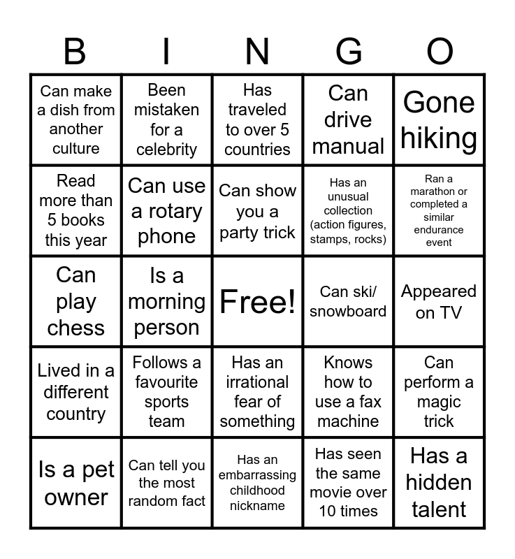 This bingo card has a free space and 51 words: Has a signature dance move, Has a hidden talent, Accidentally sent a text to the wrong person, Has an embarrassing childhood nickname, Follows a favourite sports team, Can speak a second language, Been mistaken for a celebrity, Gone to a drive-in movie theatre, Read more than 5 books this year, Is a self-proclaimed expert in something obscure, Can use a rotary phone, Can drive manual, Can perform a magic trick, Knows how to use a fax machine, Has met a celebrity, Has a tattoo, Can show you a party trick, Can ski/ snowboard, Gone camping, Gone hiking, Is a morning person, Has seen the same movie over 10 times, Can make a dish from another culture, Has an unusual collection (action figures, stamps, rocks), Tell me a joke, Had posters of celebrities on their wall, Ran a marathon or completed a similar endurance event, Plays a musical instrument, Is a pet owner, Has traveled to over 5 countries, Can do the Macarena, Been part of a musical or theatre production, Share a favourite quote, Has an unusual food combination they swear by, Volunteers for a charity, Can tell you the most random fact, Is a night owl, Enjoys crime shows, Enjoys reality TV, Enjoys gardening, Appeared on TV, Lived in a different country, Practices yoga or meditation, Broken a bone, Enjoys board games, Been a member of a book club, Can play chess, Is a parent, Owned a flip phone, Has an irrational fear of something and Enjoys extreme sports (e.g.bungee jumping or skydiving).