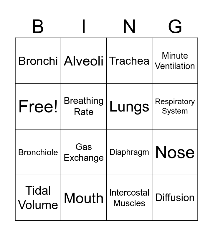 This bingo card has 16 words: Mouth, Nose, Trachea, Bronchi, Bronchiole, Alveoli, Diaphragm, Intercostal Muscles, Free!, Breathing Rate, Tidal Volume, Minute Ventilation, Gas Exchange, Respiratory System, Lungs and Diffusion.