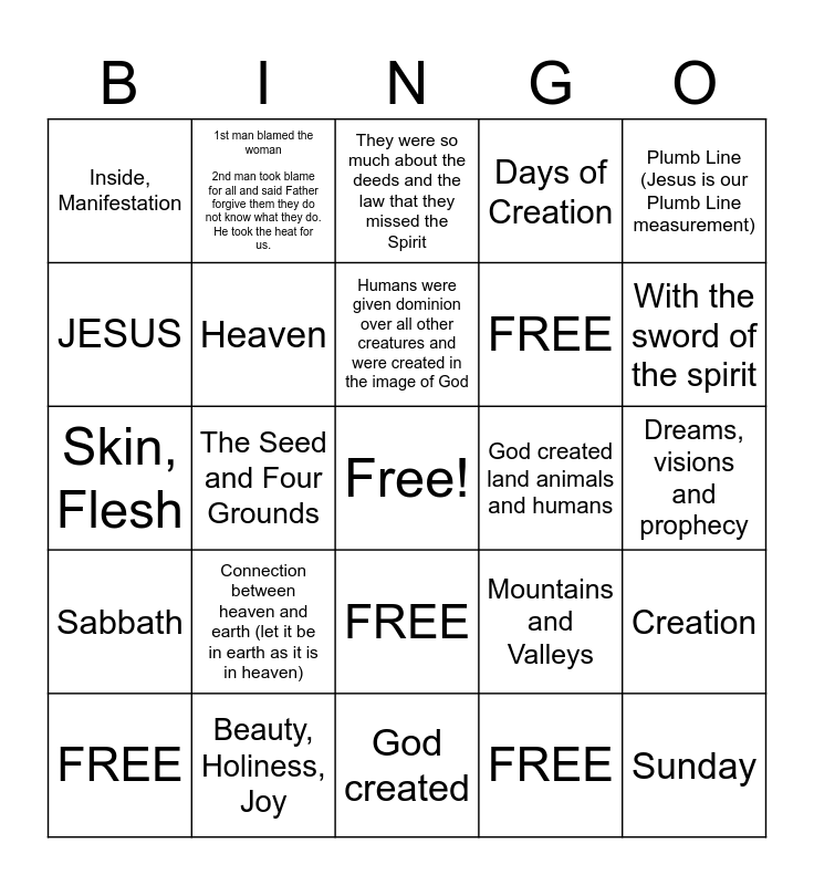 This bingo card has a free space and 24 words: Connection between heaven and earth (let it be in earth as it is in heaven), Beauty, Holiness, Joy, Humans were given dominion over all other creatures and were created in the image of God, FREE, Plumb Line (Jesus is our Plumb Line measurement), Inside, Manifestation, JESUS, 1st man blamed the woman 2nd man took blame for all and said Father forgive them they do not know what they do. He took the heat for us., God created land animals and humans, FREE, FREE, Skin, Flesh, Mountains and Valleys, Creation, Heaven, FREE, Dreams, visions and prophecy, They were so much about the deeds and the law that they missed the Spirit, With the sword of the spirit, The Seed and Four Grounds, Sunday, Sabbath, Days of Creation and God created.