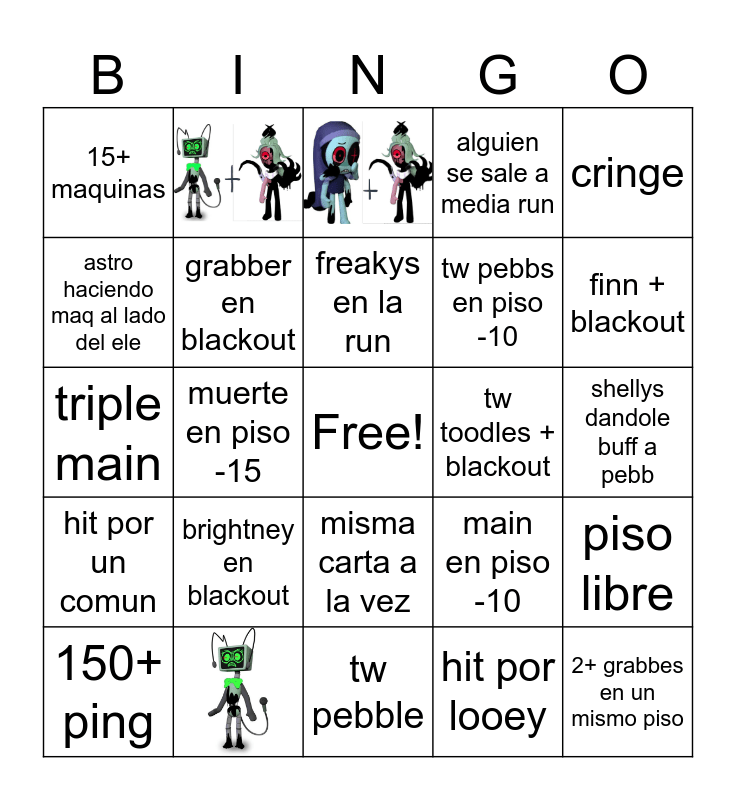 This bingo card has 3 images, a free space and 21 words: brightney en blackout, freakys en la run, 150+ ping, cringe, 15+ maquinas, astro haciendo maq al lado del ele, tw toodles + blackout, misma carta a la vez, tw pebbs en piso -10, triple main, main en piso -10, piso libre, grabber en blackout, hit por looey, shellys dandole buff a pebb, finn + blackout, muerte en piso -15, 2+ grabbes en un mismo piso, hit por un comun, alguien se sale a media run and tw pebble.