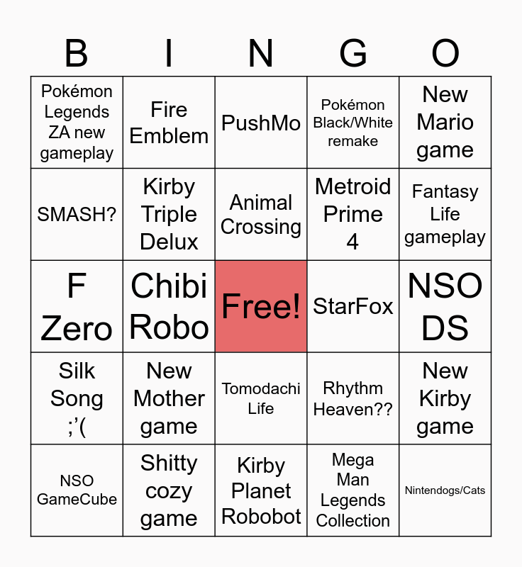 This bingo card has a free space and 24 words: New Mother game, Shitty cozy game, Animal Crossing, NSO GameCube, New Mario game, Pokémon Legends ZA new gameplay, SMASH?, Fire Emblem, StarFox, Tomodachi Life, Metroid Prime 4, F Zero, Rhythm Heaven??, New Kirby game, Kirby Triple Delux, Mega Man Legends Collection, NSO DS, PushMo, Fantasy Life gameplay, Chibi Robo, Nintendogs/Cats, Silk Song ;’(, Pokémon Black/White remake and Kirby Planet Robobot.