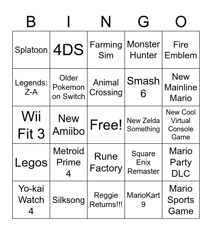 This bingo card has a free space and 24 words: Metroid Prime 4, Silksong, Animal Crossing, Yo-kai Watch 4, Fire Emblem, Splatoon, Legends: Z-A, 4DS, New Zelda Something, Rune Factory, Smash 6, Wii Fit 3, Square Enix Remaster, Mario Party DLC, Older Pokemon on Switch, MarioKart 9, New Cool Virtual Console Game, Farming Sim, New Mainline Mario, New Amiibo, Mario Sports Game, Legos, Monster Hunter and Reggie Returns!!!.