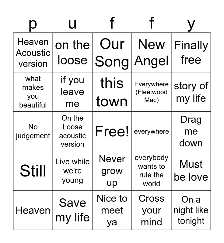 This bingo card has a free space and 24 words: Live while we're young, Save my life, this town, Heaven, Finally free, Heaven Acoustic version, what makes you beautiful, on the loose, everywhere, Never grow up, Everywhere (Fleetwood Mac), No judgement, everybody wants to rule the world, Must be love, if you leave me, Cross your mind, Drag me down, Our Song, story of my life, On the Loose acoustic version, On a night like tonight, Still, New Angel and Nice to meet ya.