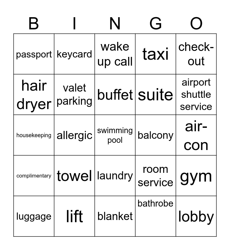 This bingo card has 25 words: towel, blanket, buffet, luggage, check-out, passport, hair dryer, keycard, balcony, laundry, suite, housekeeping, room service, gym, valet parking, lobby, air-con, wake up call, airport shuttle service, allergic, swimming pool, lift, complimentary, taxi and bathrobe.