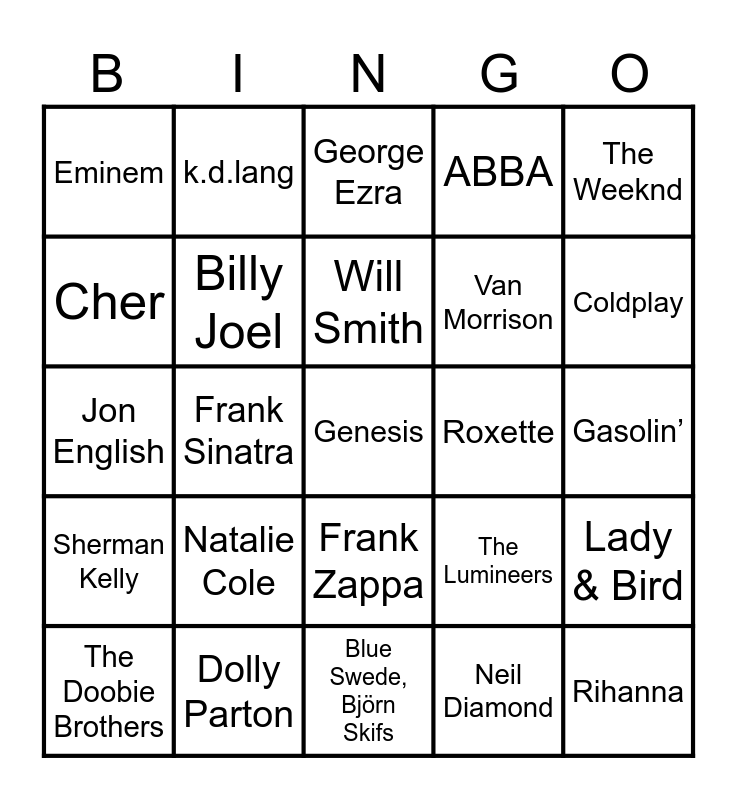 This bingo card has 25 words: Natalie Cole, Blue Swede, Björn Skifs, Will Smith, The Doobie Brothers, The Weeknd, Eminem, Cher, k.d.lang, Roxette, Frank Zappa, Van Morrison, Jon English, The Lumineers, Lady & Bird, Billy Joel, Rihanna, Gasolin’, George Ezra, Coldplay, Frank Sinatra, Genesis, Dolly Parton, Sherman Kelly, ABBA and Neil Diamond.