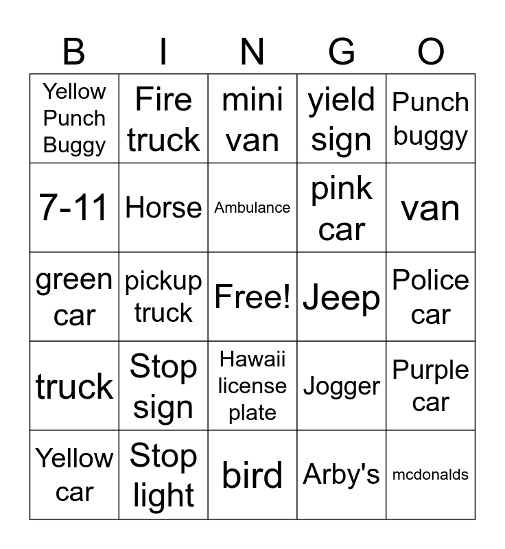 This bingo card has a free space and 24 words: Stop sign, Stop light, Ambulance, Yellow car, Punch buggy, Yellow Punch Buggy, 7-11, Fire truck, Jeep, Hawaii license plate, pink car, green car, Jogger, Purple car, Horse, Arby's, Police car, mini van, van, pickup truck, mcdonalds, truck, yield sign and bird.