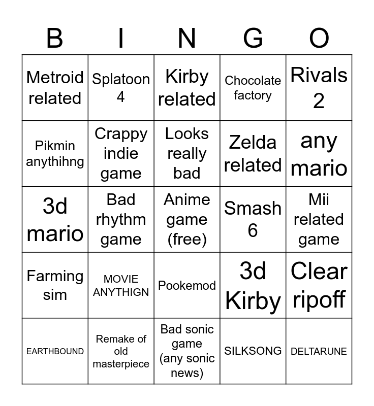 This bingo card has a free space and 24 words: MOVIE ANYTHIGN, Remake of old masterpiece, Looks really bad, EARTHBOUND, Rivals 2, Metroid related, Pikmin anythihng, Splatoon 4, Smash 6, Pookemod, Zelda related, 3d mario, 3d Kirby, Clear ripoff, Crappy indie game, SILKSONG, Mii related game, Kirby related, any mario, Bad rhythm game, DELTARUNE, Farming sim, Chocolate factory and Bad sonic game (any sonic news).