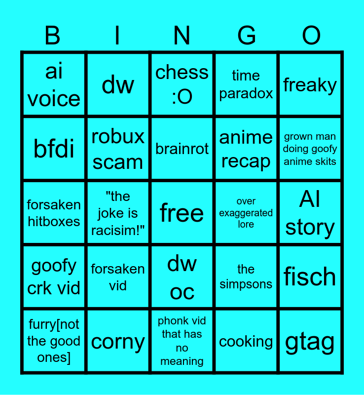 This bingo card has a free space and 24 words: forsaken vid, corny, brainrot, furry[not the good ones], freaky, ai voice, bfdi, dw, over exaggerated lore, dw oc, anime recap, forsaken hitboxes, the simpsons, fisch, robux scam, cooking, AI story, chess :O, grown man doing goofy anime skits, "the joke is racisim!", gtag, goofy crk vid, time paradox and phonk vid that has no meaning.