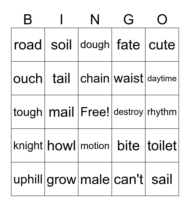 This bingo card has a free space and 49 words: train, sail, cut, male, howl, useless, soil, rode, ouch, fat, tail, fate, toilet, bite, shout, bit, chain, destroy, useful, cute, mail, can't, road, waist, it'll, daytime, uphill, thumb, motion, knight, medal, money, mild, fried, grow, joke, return, unwrap, rhythm, scrub, round, towel, petal, nickel, tough, dough, dairy, clearly and recess.