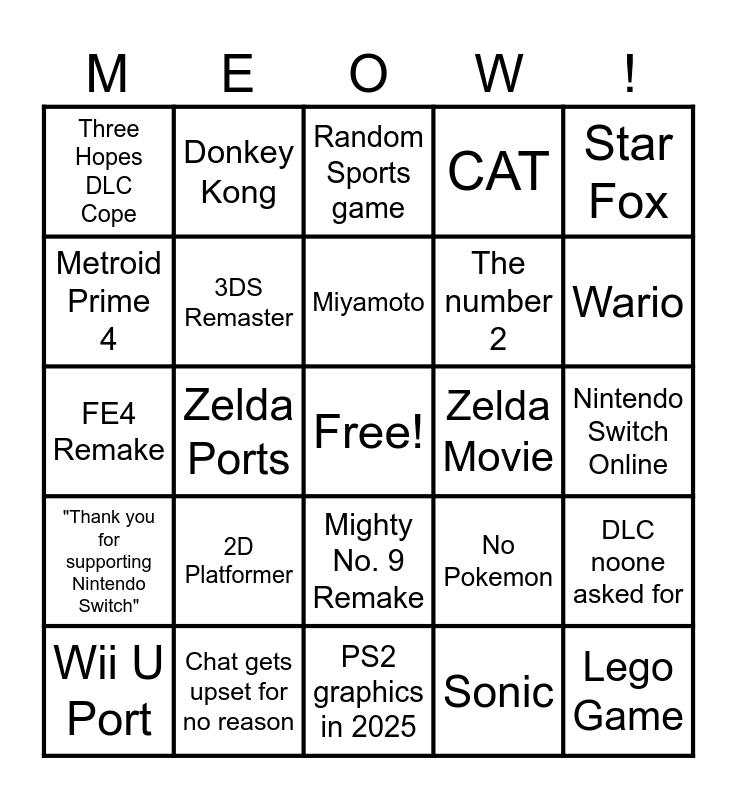 This bingo card has a free space and 24 words: 2D Platformer, Chat gets upset for no reason, Miyamoto, Wii U Port, Star Fox, Three Hopes DLC Cope, Metroid Prime 4, Donkey Kong, Zelda Movie, Mighty No. 9 Remake, The number 2, FE4 Remake, No Pokemon, DLC noone asked for, 3DS Remaster, Sonic, Nintendo Switch Online, Random Sports game, Wario, Zelda Ports, Lego Game, "Thank you for supporting Nintendo Switch", CAT and PS2 graphics in 2025.