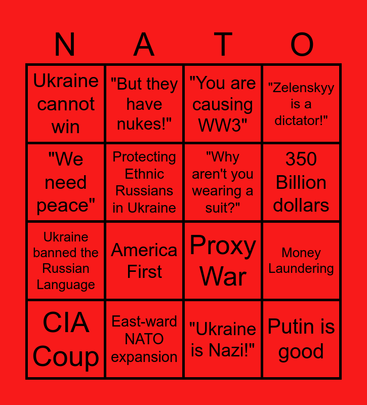 This bingo card has 16 words: East-ward NATO expansion, Money Laundering, "You are causing WW3", Ukraine cannot win, Ukraine banned the Russian Language, "But they have nukes!", Proxy War, "Ukraine is Nazi!", "We need peace", Protecting Ethnic Russians in Ukraine, CIA Coup, "Zelenskyy is a dictator!", America First, 350 Billion dollars, "Why aren't you wearing a suit?" and Putin is good.