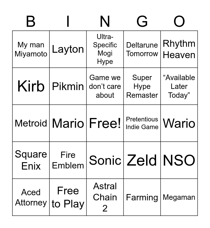 This bingo card has a free space and 24 words: Fire Emblem, Free to Play, Game we don’t care about, Aced Attorney, Rhythm Heaven, My man Miyamoto, Kirb, Layton, Pretentious Indie Game, Sonic, Super Hype Remaster, Metroid, Zeld, NSO, Pikmin, Farming, Wario, Ultra-Specific Mogi Hype, “Available Later Today”, Mario, Megaman, Square Enix, Deltarune Tomorrow and Astral Chain 2.