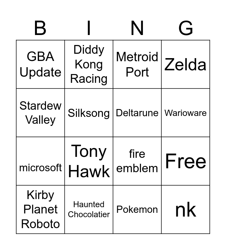 This bingo card has 17 words: Pokemon, Kirby Planet Roboto, Metroid Port, GBA Update, Tony Hawk, Zelda, Free, Deltarune, Warioware, Silksong, Haunted Chocolatier, fire emblem, Stardew Valley, Diddy Kong Racing, microsoft, Demon Slayer 2 and nk.