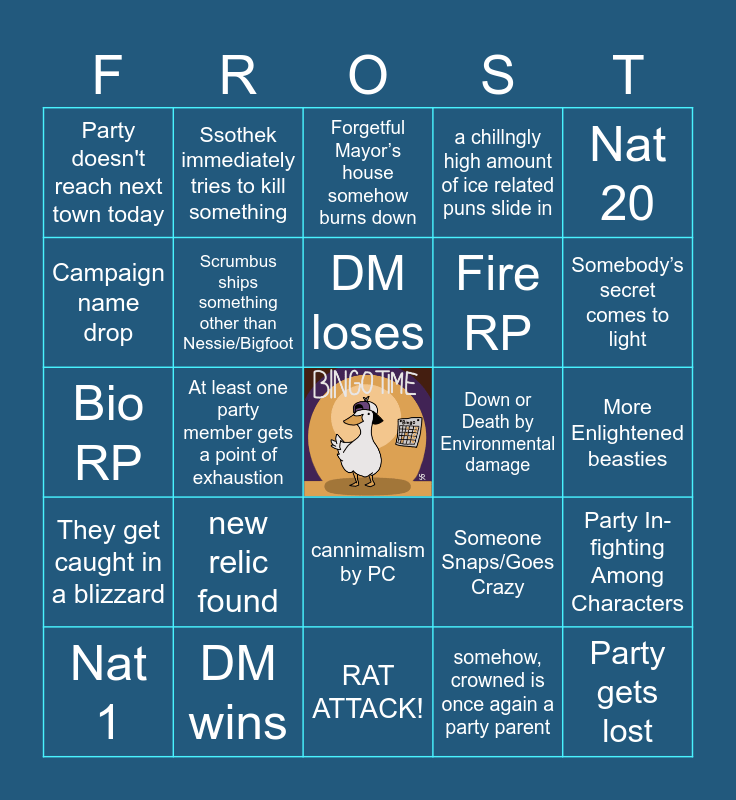This bingo card has a free space and 24 words: new relic found, DM wins, DM loses, Nat 1, Nat 20, Party doesn't reach next town today, Campaign name drop, Ssothek immediately tries to kill something, Down or Death by Environmental damage, cannimalism by PC, Fire RP, Bio RP, Someone Snaps/Goes Crazy, Party In-fighting Among Characters, Scrumbus ships something other than Nessie/Bigfoot, somehow, crowned is once again a party parent, More Enlightened beasties, Forgetful Mayor’s house somehow burns down, Somebody’s secret comes to light, At least one party member gets a point of exhaustion, Party gets lost, They get caught in a blizzard, a chillngly high amount of ice related puns slide in and RAT ATTACK!.