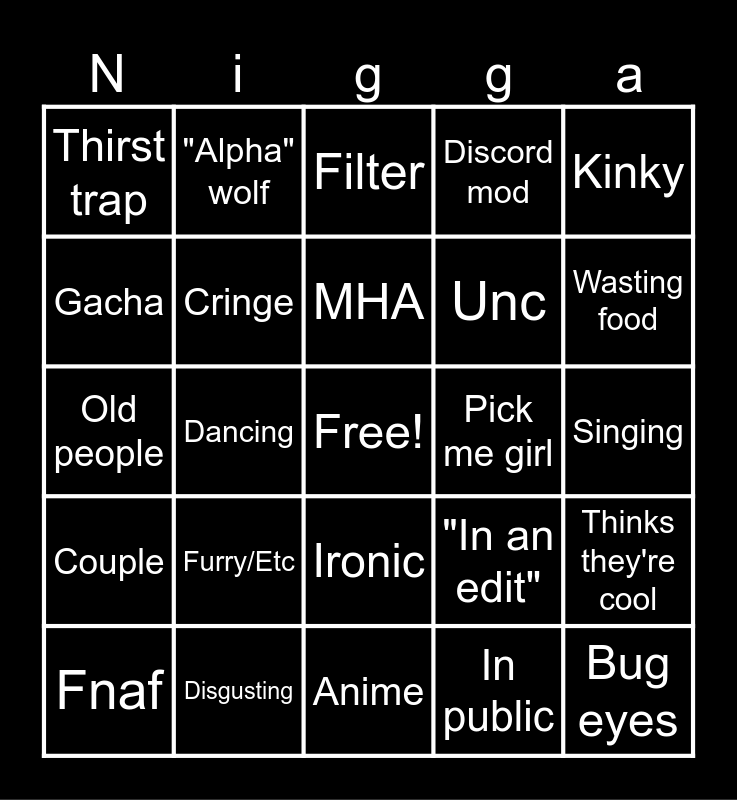 This bingo card has a free space and 24 words: Furry/Etc, Disgusting, MHA, Fnaf, Kinky, Thirst trap, Gacha, "Alpha" wolf, Pick me girl, Ironic, Unc, Old people, "In an edit", Thinks they're cool, Cringe, In public, Singing, Filter, Wasting food, Dancing, Bug eyes, Couple, Discord mod and Anime.