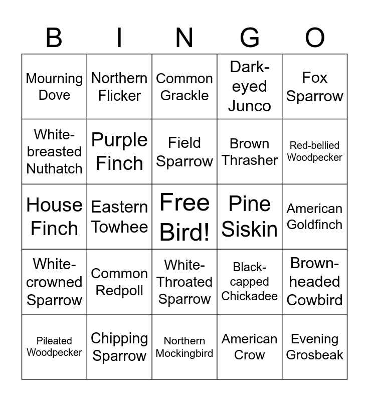 This bingo card has a free space and 41 words: American Robin, House Finch, Northern Cardinal, Purple Finch, Chipping Sparrow, White-Throated Sparrow, Field Sparrow, Song Sparrow, Fox Sparrow, White-crowned Sparrow, Eastern Towhee, Dark-eyed Junco, Evening Grosbeak, American Goldfinch, Pine Siskin, Common Redpoll, House Sparrow, Mourning Dove, Red-winged Blackbird, Common Grackle, Brown-headed Cowbird, Baltimore Oriole, Northern Mockingbird, Brown Thrasher, European Starling, Blue Jay, American Crow, Eastern Bluebird, Red-bellied Woodpecker, Downy Woodpecker, Hairy Woodpecker, Northern Flicker, Pileated Woodpecker, Tufted Titmouse, Black-capped Chickadee, White-breasted Nuthatch, Red-breasted Nuthatch, Brown Creeper, Common Wren, Ruby-crowned Kinglet and Black-billed Magpie.