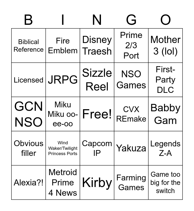 This bingo card has a free space and 24 words: Wind Waker/Twilight Princess Ports, Metroid Prime 4 News, Sizzle Reel, Alexia?!, Mother 3 (lol), Biblical Reference, Licensed, Fire Emblem, CVX REmake, Capcom IP, NSO Games, GCN NSO, Yakuza, Legends Z-A, JRPG, Farming Games, Babby Gam, Disney Traesh, First-Party DLC, Miku Miku oo-ee-oo, Game too big for the switch, Obvious filler, Prime 2/3 Port and Kirby.
