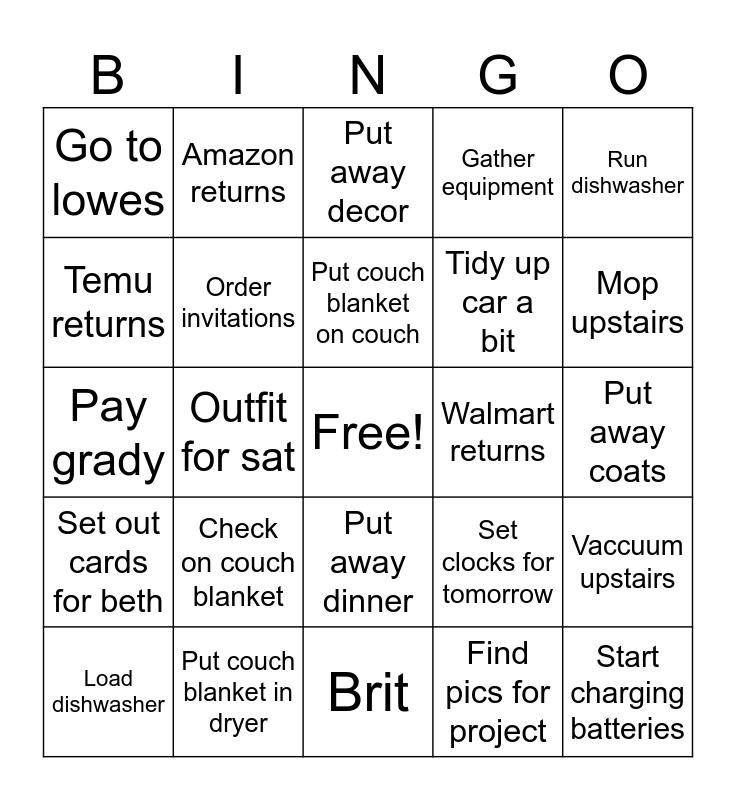 This bingo card has a free space and 24 words: Check on couch blanket, Put couch blanket in dryer, Put couch blanket on couch, Load dishwasher, Run dishwasher, Go to lowes, Temu returns, Amazon returns, Walmart returns, Put away dinner, Tidy up car a bit, Pay grady, Set clocks for tomorrow, Vaccuum upstairs, Order invitations, Find pics for project, Put away coats, Put away decor, Mop upstairs, Outfit for sat, Start charging batteries, Set out cards for beth, Gather equipment and Brit.