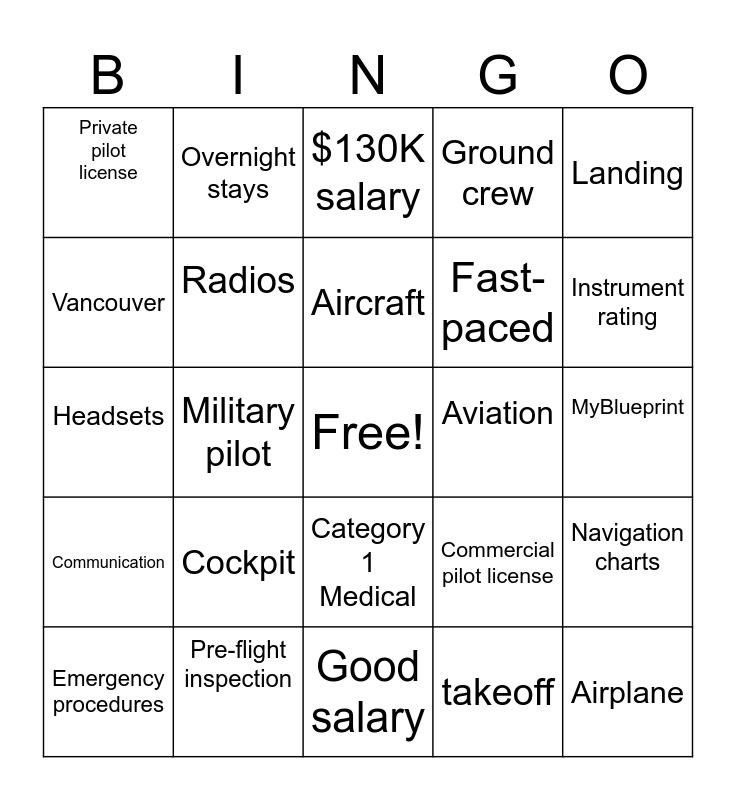 This bingo card has a free space and 24 words: Cockpit, Pre-flight inspection, Aircraft, Emergency procedures, Landing, Private pilot license, Vancouver, Overnight stays, Aviation, Category 1 Medical, Fast-paced, Headsets, Commercial pilot license, Navigation charts, Radios, takeoff, MyBlueprint, $130K salary, Instrument rating, Military pilot, Airplane, Communication, Ground crew and Good salary.