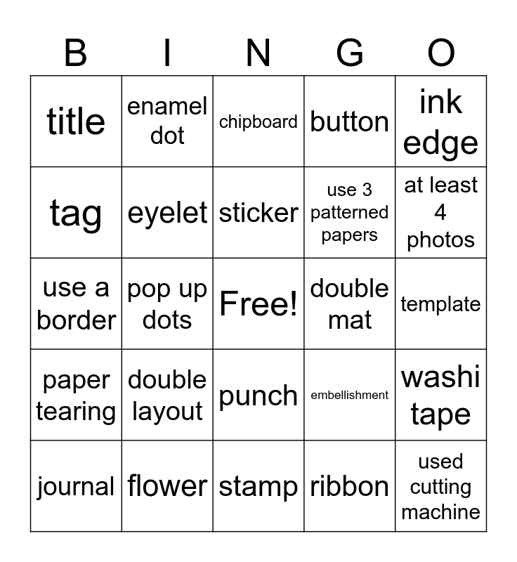 This bingo card has a free space and 24 words: double layout, flower, sticker, journal, ink edge, title, tag, enamel dot, double mat, punch, use 3 patterned papers, use a border, embellishment, washi tape, eyelet, ribbon, template, chipboard, at least 4 photos, pop up dots, used cutting machine, paper tearing, button and stamp.