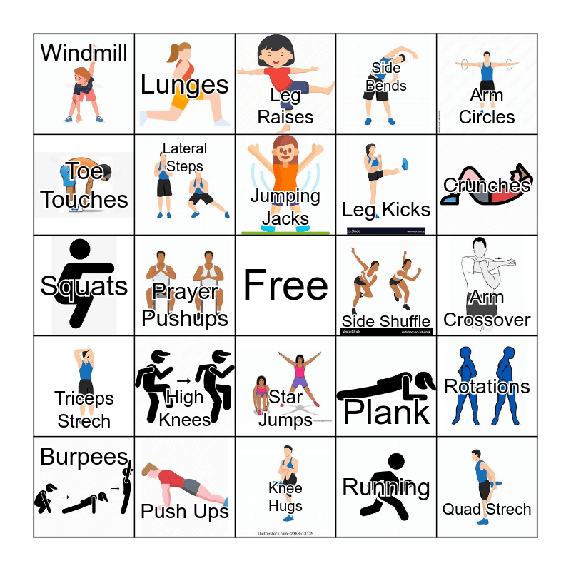 This bingo card has 24 images, a free space and 24 words: High Knees, Push Ups, Jumping Jacks, Burpees, Arm Circles, Windmill, Toe Touches, Lunges, Side Shuffle, Star Jumps, Leg Kicks, Squats, Plank, Rotations, Lateral Steps, Running, Arm Crossover, Leg Raises, Crunches, Prayer Pushups, Quad Strech, Triceps Strech, Side Bends and Knee Hugs.