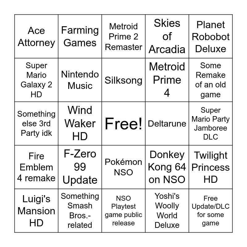 This bingo card has a free space and 24 words: F-Zero 99 Update, Something Smash Bros.-related, Silksong, Luigi's Mansion HD, Planet Robobot Deluxe, Ace Attorney, Super Mario Galaxy 2 HD, Farming Games, Deltarune, Pokémon NSO, Metroid Prime 4, Something else 3rd Party idk, Donkey Kong 64 on NSO, Twilight Princess HD, Nintendo Music, Yoshi's Woolly World Deluxe, Super Mario Party Jamboree DLC, Metroid Prime 2 Remaster, Some Remake of an old game, Wind Waker HD, Free Update/DLC for some game, Fire Emblem 4 remake, Skies of Arcadia and NSO Playtest game public release.