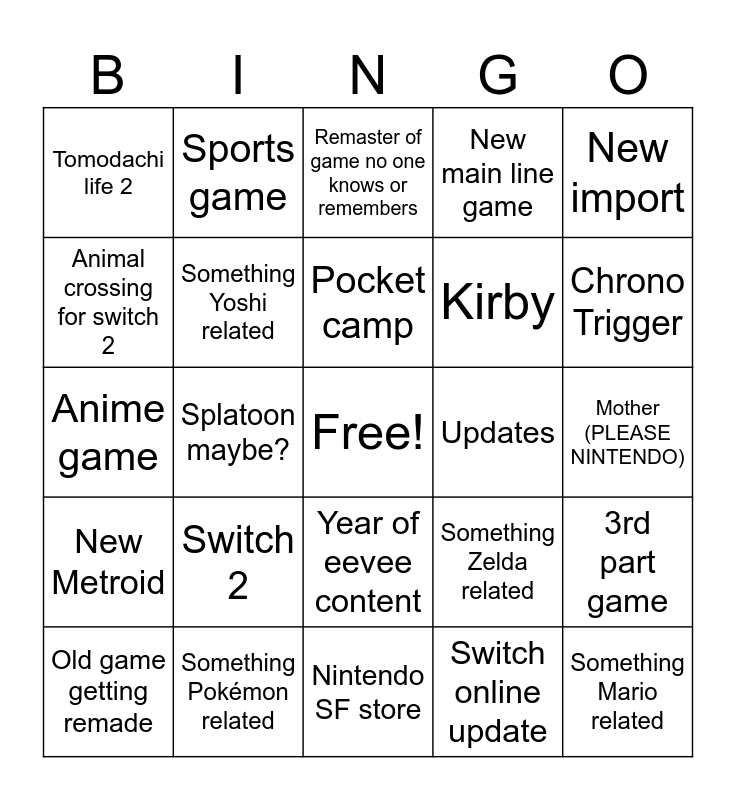 This bingo card has a free space and 24 words: Switch 2, Something Pokémon related, Pocket camp, Old game getting remade, New import, Tomodachi life 2, Animal crossing for switch 2, Sports game, Updates, Year of eevee content, Kirby, Anime game, Something Zelda related, 3rd part game, Something Yoshi related, Switch online update, Mother (PLEASE NINTENDO), Remaster of game no one knows or remembers, Chrono Trigger, Splatoon maybe?, Something Mario related, New Metroid, New main line game and Nintendo SF store.