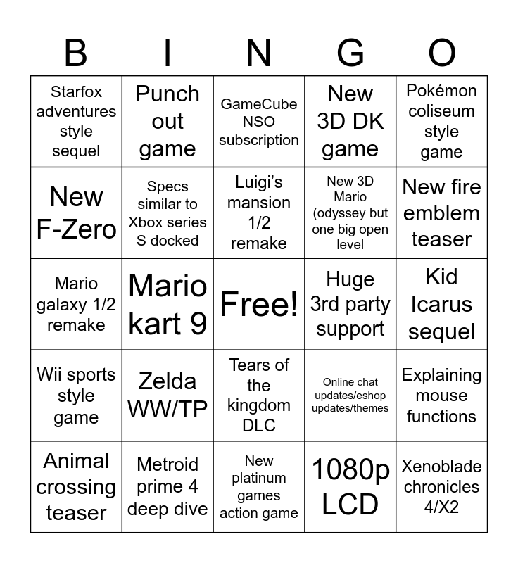 This bingo card has a free space and 24 words: Zelda WW/TP, Metroid prime 4 deep dive, Luigi’s mansion 1/2 remake, Animal crossing teaser, Pokémon coliseum style game, Starfox adventures style sequel, New F-Zero, Punch out game, Huge 3rd party support, Tears of the kingdom DLC, New 3D Mario (odyssey but one big open level, Mario galaxy 1/2 remake, Online chat updates/eshop updates/themes, Explaining mouse functions, Specs similar to Xbox series S docked, 1080p LCD, Kid Icarus sequel, GameCube NSO subscription, New fire emblem teaser, Mario kart 9, Xenoblade chronicles 4/X2, Wii sports style game, New 3D DK game and New platinum games action game.