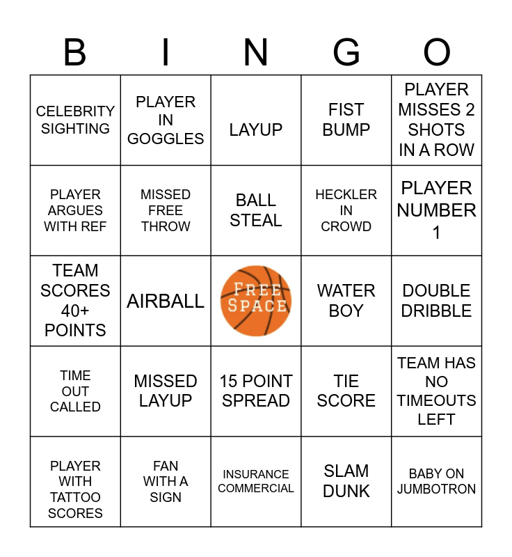 This bingo card has a free space and 30 words: FAN WITH A SIGN, MASCOT DANCING, AIRBALL, JUMP BALL, CELEBRITY SIGHTING, LAYUP, MISSED FREE THROW, 15 POINT SPREAD, WATER BOY, INSURANCE COMMERCIAL, DOUBLE DRIBBLE, BABY ON JUMBOTRON, SLAM DUNK, SHOOTING SLEEVE, PLAYER NUMBER 1, KNEE BRACE, TIE SCORE, TIME OUT CALLED, MISSED LAYUP, PLAYER MISSES 2 SHOTS IN A ROW, TEAM SCORES 40+ POINTS, VIDEO REVIEW, PLAYER IN GOGGLES, HECKLER IN CROWD, PLAYER ARGUES WITH REF, FIST BUMP, TEAM HAS NO TIMEOUTS LEFT, PLAYER WITH TATTOO SCORES, BALL STEAL and BUZZER SHOT.