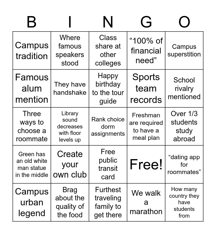 This bingo card has 25 words: Create your own club, Furthest traveling family to get there, Happy birthday to the tour guide, Campus urban legend, Campus superstition, Campus tradition, Famous alum mention, Where famous speakers stood, Freshman are required to have a meal plan, Free public transit card, Sports team records, Three ways to choose a roommate, Free!, “dating app for roommates”, They have handshake, How many country they have students from, Over 1/3 students study abroad, Class share at other colleges, School rivalry mentioned, Library sound decreases with floor levels up, Rank choice dorm assignments, Brag about the quality of the food, Green has an old white man statue in the middle, “100% of financial need” and We walk a marathon.