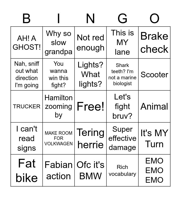 This bingo card has a free space and 24 words: MAKE ROOM FOR VOLKWAGEN, Fabian action, Lights? What lights?, Fat bike, Brake check, AH! A GHOST!, Nah, sniff out what direction I'm going, Why so slow grandpa, Let's fight bruv?, Tering herrie, Shark teeth? I'm not a marine biologist, TRUCKER, Super effective damage, It's MY Turn, You wanna win this fight?, Rich vocabulary, Animal, Not red enough, Scooter, Hamilton zooming by, EMO EMO EMO, I can't read signs, This is MY lane and Ofc it's BMW.