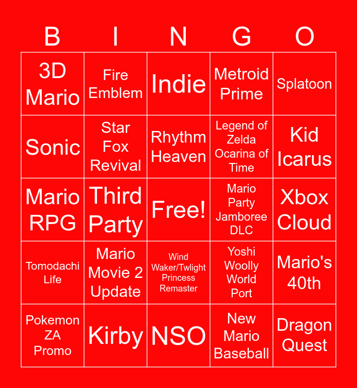 This bingo card has a free space and 24 words: Mario Movie 2 Update, Kirby, Rhythm Heaven, Pokemon ZA Promo, Splatoon, 3D Mario, Sonic, Fire Emblem, Mario Party Jamboree DLC, Wind Waker/Twlight Princess Remaster, Legend of Zelda Ocarina of Time, Mario RPG, Yoshi Woolly World Port, Mario's 40th, Star Fox Revival, New Mario Baseball, Xbox Cloud, Indie, Kid Icarus, Third Party, Dragon Quest, Tomodachi Life, Metroid Prime and NSO.