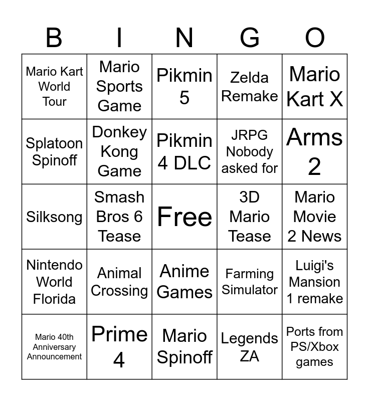 This bingo card has a free space and 24 words: Animal Crossing, Prime 4, Pikmin 4 DLC, Mario 40th Anniversary Announcement, Mario Kart X, Mario Kart World Tour, Splatoon Spinoff, Mario Sports Game, 3D Mario Tease, Anime Games, JRPG Nobody asked for, Silksong, Farming Simulator, Luigi's Mansion 1 remake, Donkey Kong Game, Legends ZA, Mario Movie 2 News, Pikmin 5, Arms 2, Smash Bros 6 Tease, Ports from PS/Xbox games, Nintendo World Florida, Zelda Remake and Mario Spinoff.