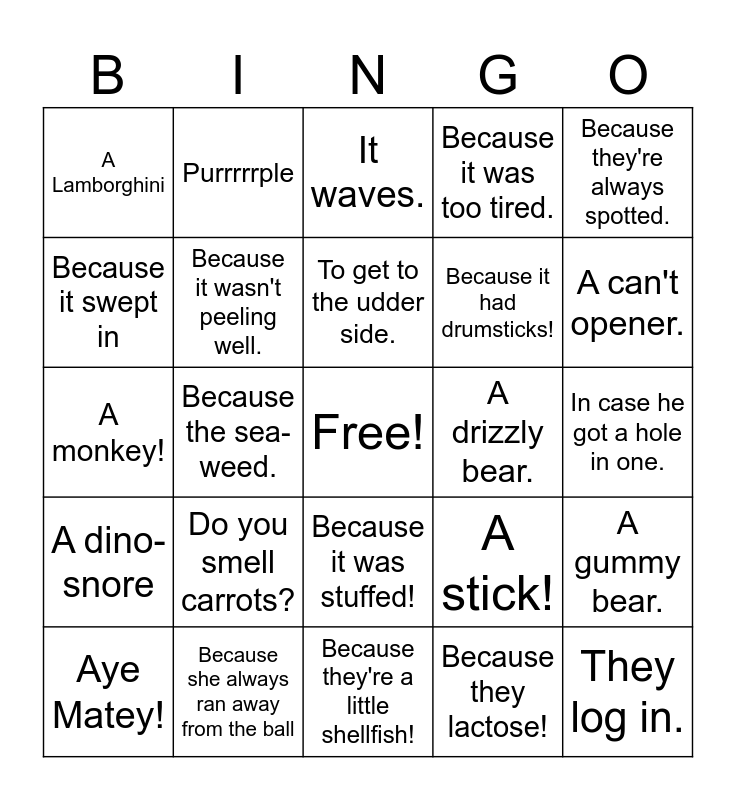This bingo card has a free space and 24 words: Do you smell carrots?, Because she always ran away from the ball, To get to the udder side., Aye Matey!, Because they're always spotted., A Lamborghini, Because it swept in, Purrrrrple, A drizzly bear., Because it was stuffed!, Because it had drumsticks!, A monkey!, A stick!, A gummy bear., Because it wasn't peeling well., Because they lactose!, In case he got a hole in one., It waves., A can't opener., Because the sea-weed., They log in., A dino-snore, Because it was too tired. and Because they're a little shellfish!.