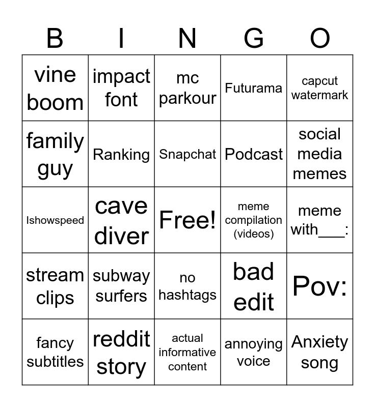 This bingo card has a free space and 38 words: pokemon cards, Art, Yapping, Ranking, Pov:, subway surfers, Snapchat, AI, capcut watermark, Podcast, cave diver, Futurama, Anxiety song, meme with___:, family guy, stream clips, stupid people, mc parkour, Skit, meme compilation (videos), vine boom, reddit story, social media memes, fancy subtitles, "dont check the sound", actual informative content, small creator, Dropshipper, diddy moment, sped up song, skull emoji, no hashtags, annoying voice, impact font, bad recording, bad edit, Ishowspeed and Free space.
