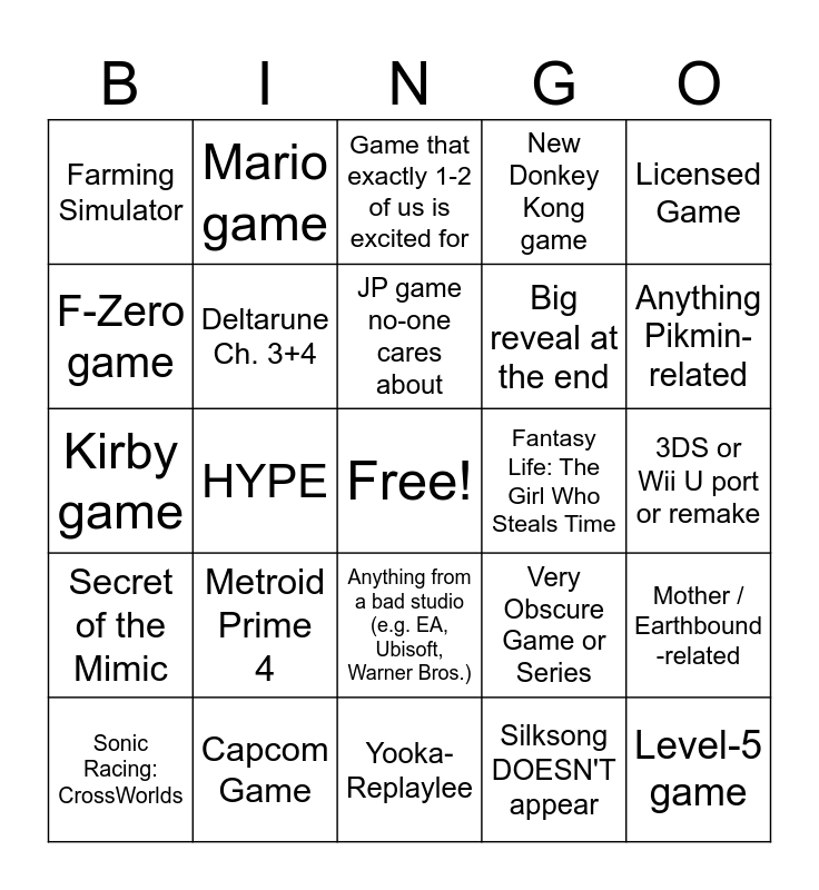 This bingo card has a free space and 24 words: Metroid Prime 4, Capcom Game, JP game no-one cares about, Sonic Racing: CrossWorlds, Licensed Game, Farming Simulator, F-Zero game, Mario game, Fantasy Life: The Girl Who Steals Time, Anything from a bad studio (e.g. EA, Ubisoft, Warner Bros.), Big reveal at the end, Kirby game, Very Obscure Game or Series, Mother / Earthbound -related, Deltarune Ch. 3+4, Silksong DOESN'T appear, 3DS or Wii U port or remake, Game that exactly 1-2 of us is excited for, Anything Pikmin- related, HYPE, Level-5 game, Secret of the Mimic, New Donkey Kong game and Yooka-Replaylee.