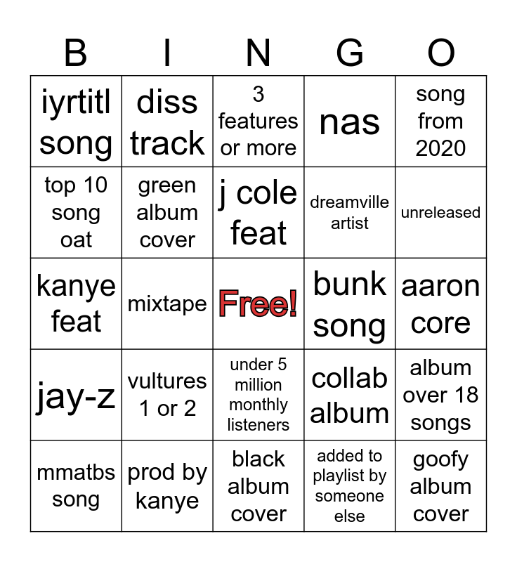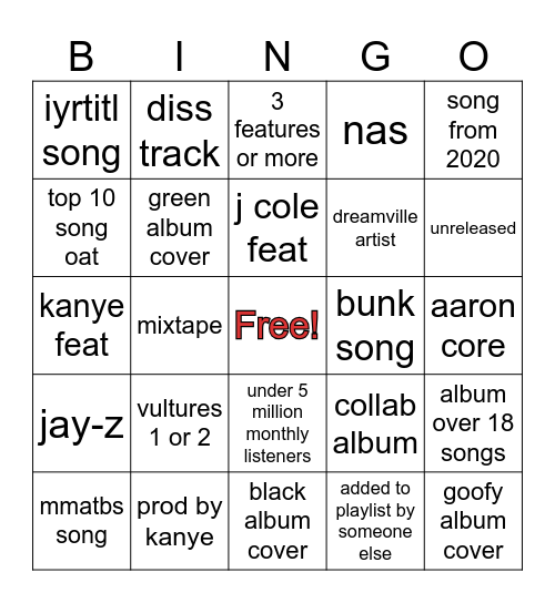 This bingo card has a free space and 24 words: vultures 1 or 2, prod by kanye, j cole feat, mmatbs song, song from 2020, iyrtitl song, top 10 song oat, diss track, bunk song, under 5 million monthly listeners, dreamville artist, kanye feat, collab album, album over 18 songs, green album cover, added to playlist by someone else, aaron core, 3 features or more, unreleased, mixtape, goofy album cover, jay-z, nas and black album cover.