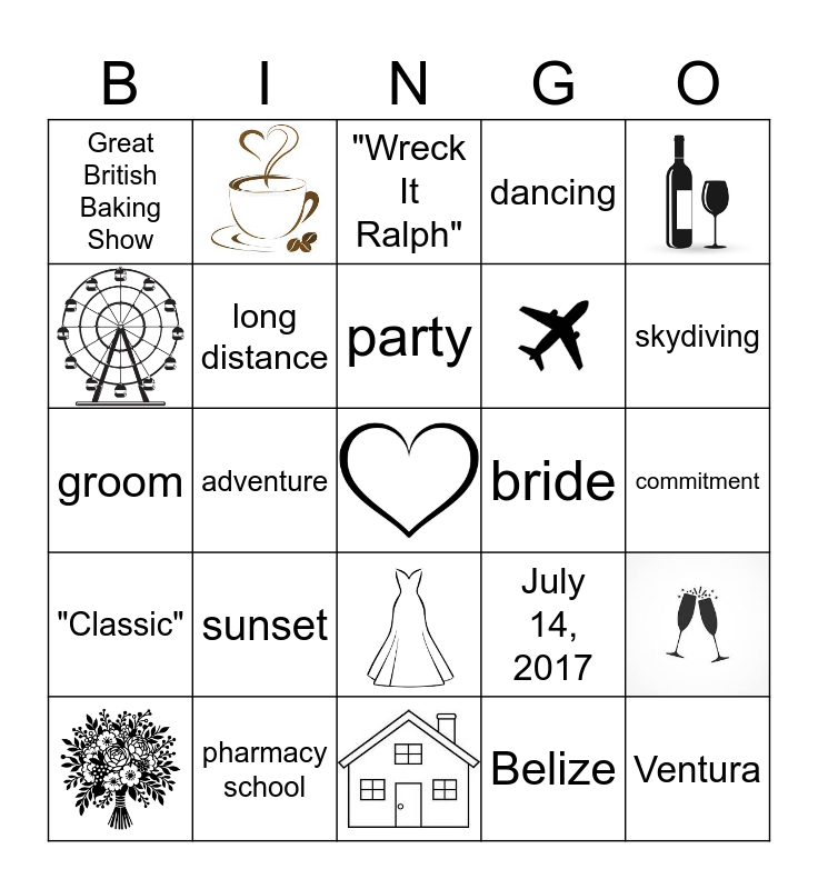 This bingo card has 8 images, a free space and 16 words: sunset, pharmacy school, party, Great British Baking Show, bride, groom, July 14, 2017, long distance, Belize, commitment, "Wreck It Ralph", skydiving, adventure, Ventura, "Classic" and dancing.