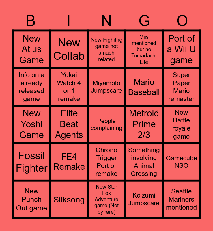 This bingo card has a free space and 24 words: FE4 Remake, Silksong, Miyamoto Jumpscare, New Punch Out game, Port of a Wii U game, New Atlus Game, Info on a already released game, New Collab, Metroid Prime 2/3, Chrono Trigger Port or remake, Mario Baseball, New Yoshi Game, Something involving Animal Crossing, Gamecube NSO, Yokai Watch 4 or 1 remake, Koizumi Jumpscare, New Battle royale game, New Fighitng game not smash related, Super Paper Mario remaster, Elite Beat Agents, Seattle Mariners mentioned, Fossil Fighter, Miis mentioned but no Tomadachi Life and New Star Fox Adventure game (Not by rare).