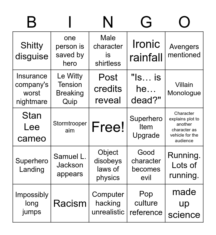 This bingo card has a free space and 24 words: Samuel L. Jackson appears, Racism, Post credits reveal, Impossibly long jumps, Avengers mentioned, Shitty disguise, Insurance company's worst nightmare, one person is saved by hero, Superhero Item Upgrade, Object disobeys laws of physics, "Is… is he… dead?", Stan Lee cameo, Good character becomes evil, Running. Lots of running., Le Witty Tension Breaking Quip, Pop culture reference, Character explains plot to another character as vehicle for the audience, Male character is shirtless, Villain Monologue, Stormtrooper aim, made up science, Superhero Landing, Ironic rainfall and Computer hacking unrealistic.