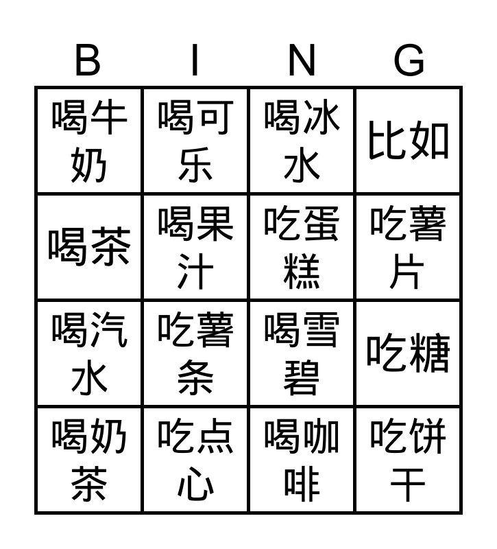 This bingo card has 16 words: 吃点心, 吃糖, 喝冰水, 喝牛奶, 喝汽水, 喝可乐, 喝雪碧, 喝咖啡, 喝茶, 喝果汁, 喝奶茶, 比如, 吃薯条, 吃薯片, 吃蛋糕 and 吃饼干.