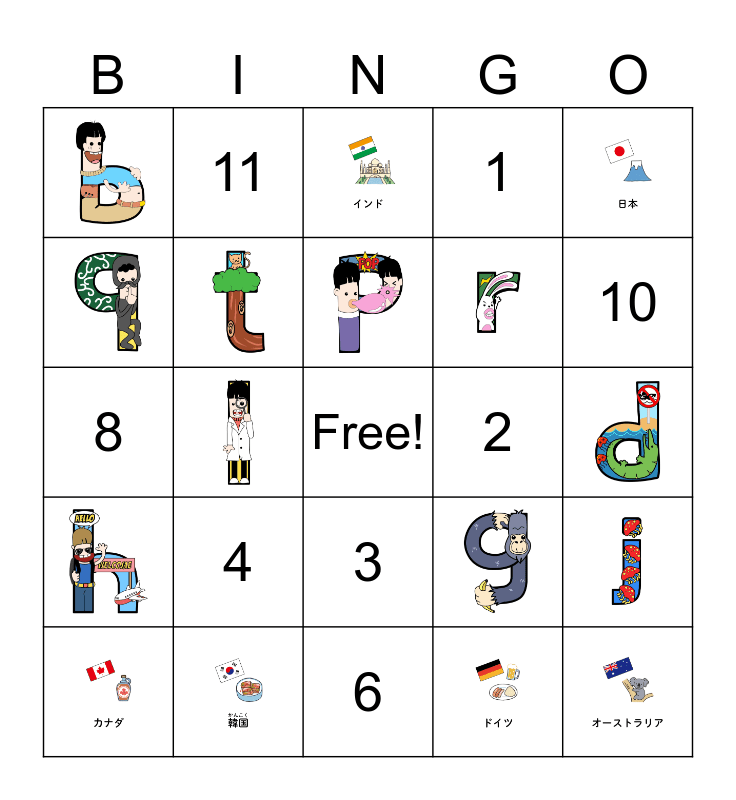 This bingo card has 31 images, a free space and 12 words: 1, 2, 3, 4, 5, 6, 7, 8, 9, 10, 11 and 12.
