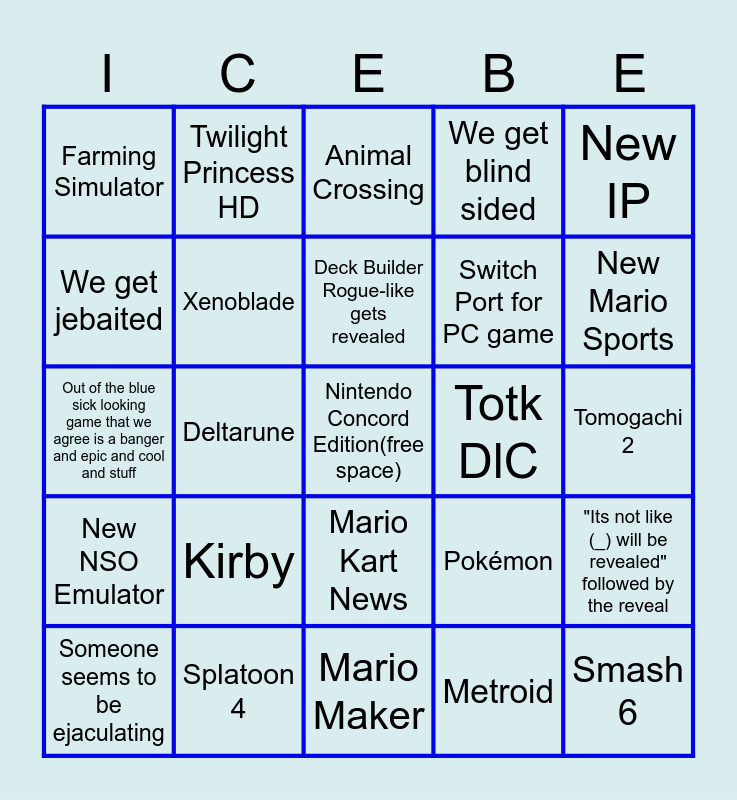 This bingo card has a free space and 30 words: Splatoon 4, New 3d Mario, Deltarune, Silksong, Farming Simulator, Animal Crossing, Xenoblade, Mario Kart News, Totk DlC, Mario Maker, Tomogachi 2, Smash 6, Metroid, Arms 2(Legs?), New Mario Sports, Amiibos, Pokémon, New NSO Emulator, Kirby, New IP, Out of the blue sick looking game that we agree is a banger and epic and cool and stuff, Dead Franchise Returns, Twilight Princess HD, Switch Port for PC game, We get jebaited, We get blind sided, "Its not like (_) will be revealed" followed by the reveal, Someone seems to be ejaculating, Deck Builder Rogue-like gets revealed and Downwell.