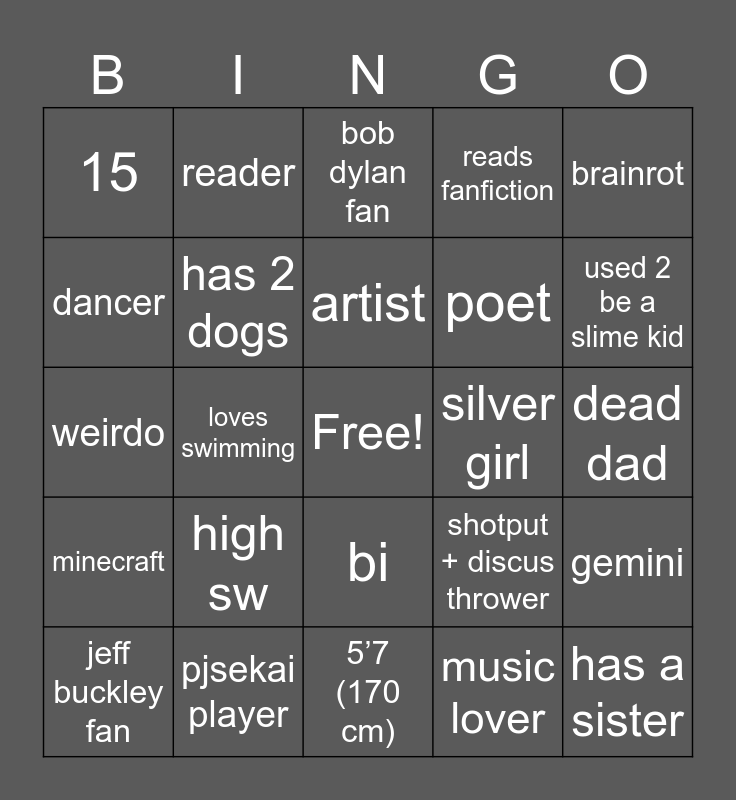 This bingo card has a free space and 24 words: high sw, pjsekai player, artist, jeff buckley fan, brainrot, 15, dancer, reader, silver girl, bi, poet, weirdo, shotput + discus thrower, gemini, has 2 dogs, music lover, dead dad, bob dylan fan, used 2 be a slime kid, loves swimming, has a sister, minecraft, reads fanfiction and 5’7 (170 cm).