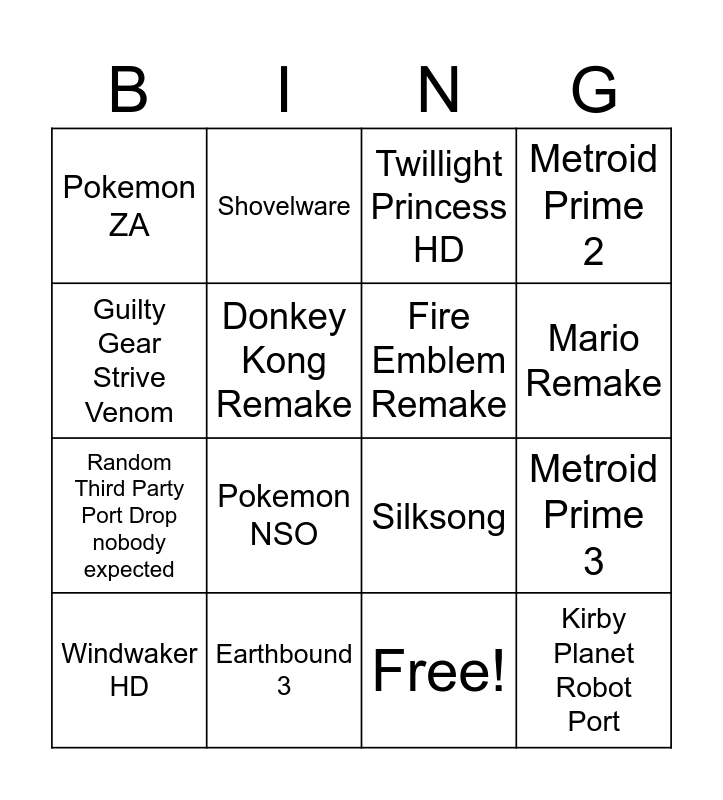 This bingo card has 17 words: Free!, Windwaker HD, Twillight Princess HD, Pokemon ZA, Pokemon NSO, Metroid Prime 2, Metroid Prime 3, Fire Emblem Remake, Mario Remake, Donkey Kong Remake, Earthbound 3, Silksong, Guilty Gear Strive Venom, Shovelware, Random Third Party Port Drop nobody expected, Bayonetta 4 LMAO and Kirby Planet Robot Port.