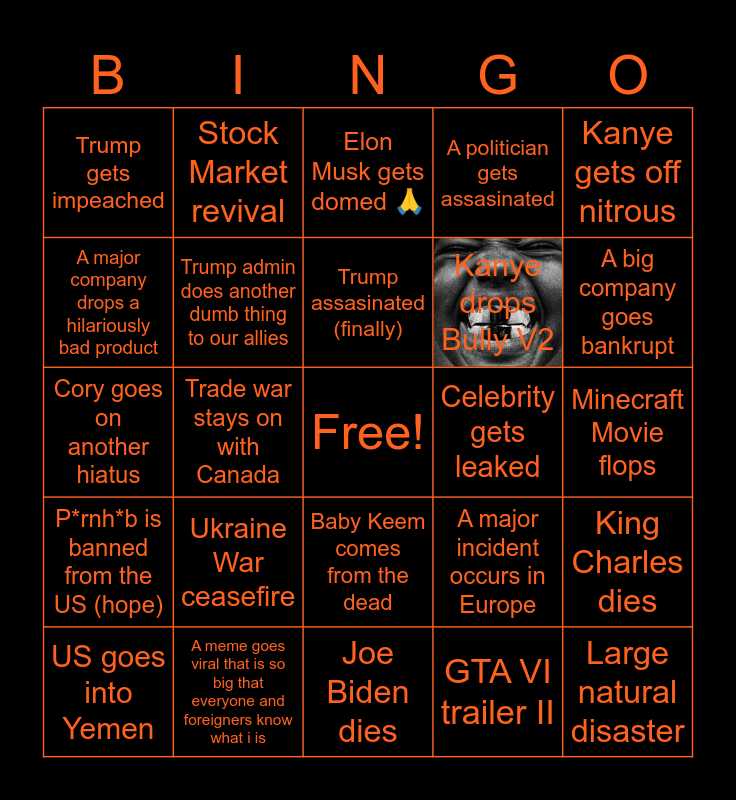 This bingo card has 1 images, a free space and 24 words: US goes into Yemen, Ukraine War ceasefire, Trump assasinated (finally), GTA VI trailer II, Kanye gets off nitrous, Trump gets impeached, Stock Market revival, Elon Musk gets domed 🙏, Celebrity gets leaked, Minecraft Movie flops, Cory goes on another hiatus, Trump admin does another dumb thing to our allies, A major incident occurs in Europe, King Charles dies, A major company drops a hilariously bad product, A meme goes viral that is so big that everyone and foreigners know what i is, Joe Biden dies, A politician gets assasinated, A big company goes bankrupt, P*rnh*b is banned from the US (hope), Trade war stays on with Canada, Baby Keem comes from the dead, Kanye drops Bully V2 and Large natural disaster.