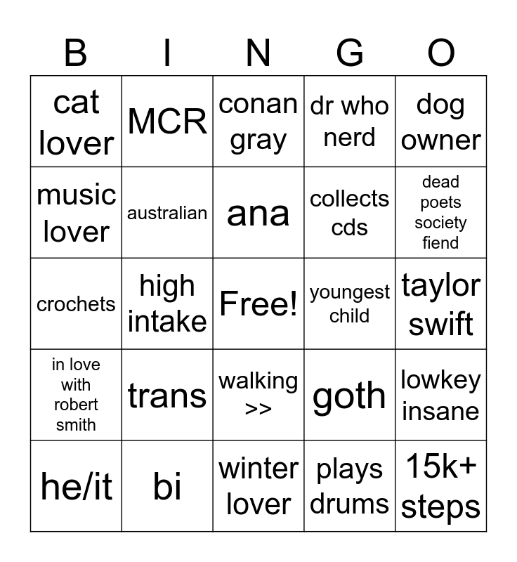 This bingo card has a free space and 24 words: trans, bi, ana, he/it, dog owner, cat lover, music lover, MCR, youngest child, walking >>, collects cds, crochets, goth, lowkey insane, australian, plays drums, taylor swift, conan gray, dead poets society fiend, high intake, 15k+ steps, in love with robert smith, dr who nerd and winter lover.
