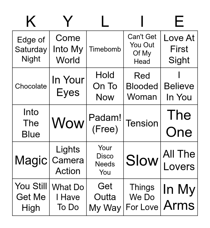 This bingo card has a free space and 29 words: You Still Get Me High, Dance Alone, Wow, German Bold Italic, Edge of Saturday Night, Timebomb, In Your Eyes, Lights Camera Action, Tension, What Do I Have To Do, The One, In My Arms, Get Outta My Way, Things We Do For Love, I Believe In You, Green Light, Your Disco Needs You, Magic, Love At First Sight, Into The Blue, Slow, Sexercize, Red Blooded Woman, Chocolate, Can't Get You Out Of My Head, Come Into My World, All The Lovers, Hold On To Now and On A Night Like This.