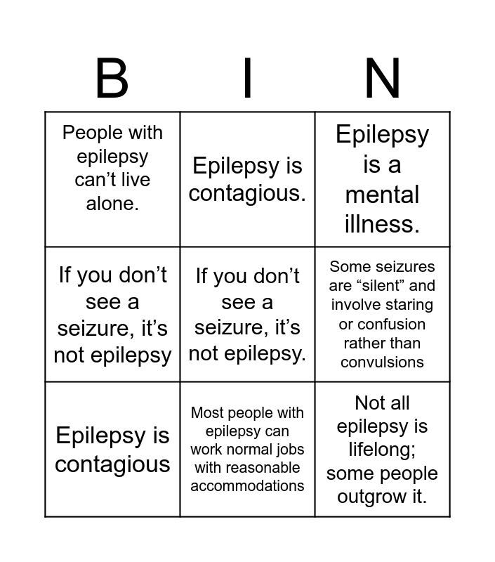 This bingo card has a free space and 16 words: All seizures involve convulsions., Some seizures are “silent” and involve staring or confusion rather than convulsions., Epilepsy is a mental illness., People with epilepsy can’t live alone., Most people with epilepsy can work normal jobs with reasonable accommodations., Epilepsy is contagious., Many people with epilepsy can drive if their seizures are controlled., All seizures involve convulsions, Not all epilepsy is lifelong; some people outgrow it., Some seizures are “silent” and involve staring or confusion rather than convulsions, Epilepsy is a mental illness, If you don’t see a seizure, it’s not epilepsy, People with epilepsy can’t live alone, Most people with epilepsy can work normal jobs with reasonable accommodations, Epilepsy is contagious and Many people with epilepsy can drive if their seizures are controlled..