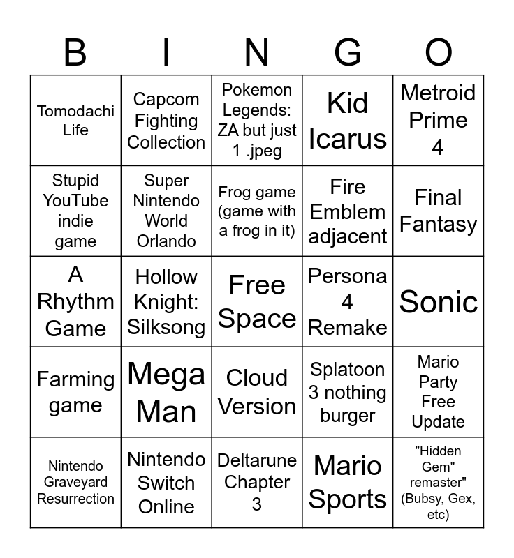 This bingo card has a free space and 24 words: Mega Man, Nintendo Switch Online, Frog game (game with a frog in it), Nintendo Graveyard Resurrection, Metroid Prime 4, Tomodachi Life, Stupid YouTube indie game, Capcom Fighting Collection, Persona 4 Remake, Cloud Version, Fire Emblem adjacent, A Rhythm Game, Splatoon 3 nothing burger, Mario Party Free Update, Super Nintendo World Orlando, Mario Sports, Sonic, Pokemon Legends: ZA but just 1 .jpeg, Final Fantasy, Hollow Knight: Silksong, "Hidden Gem" remaster" (Bubsy, Gex, etc), Farming game, Kid Icarus and Deltarune Chapter 3.